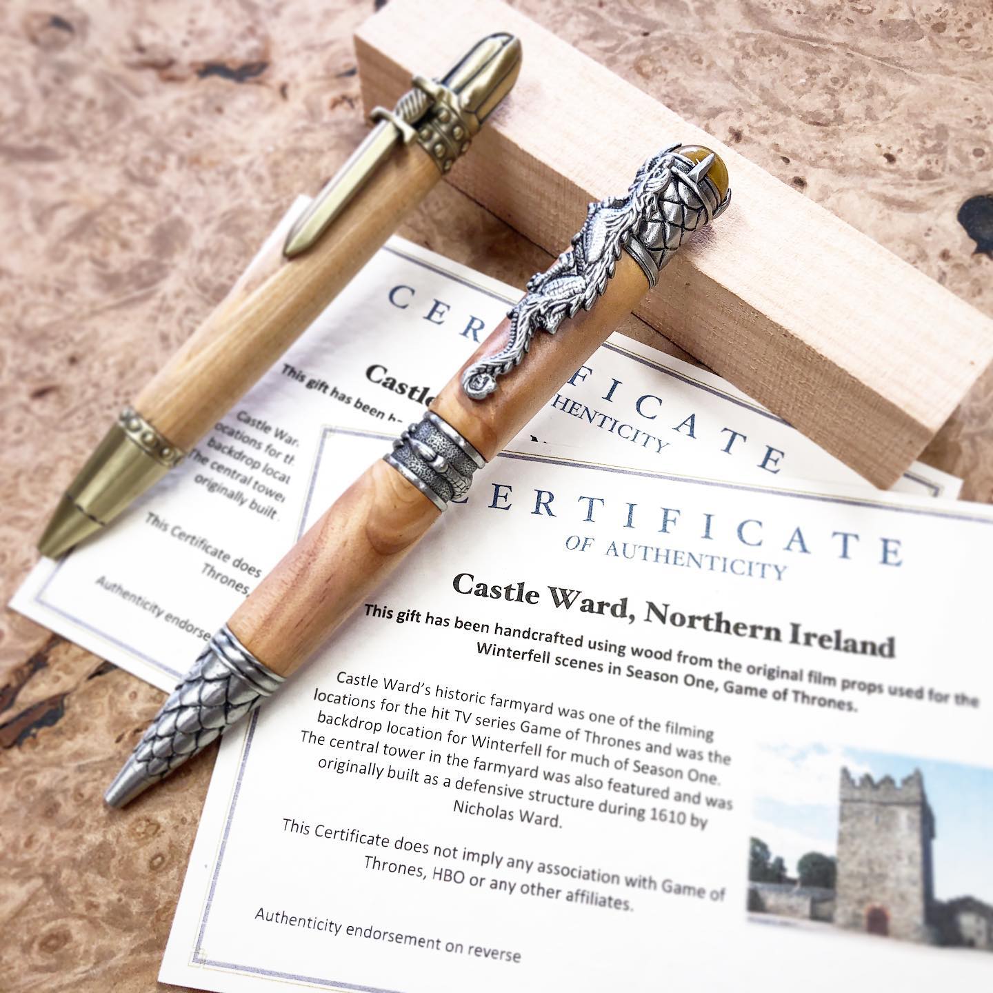 Made with wood reclaimed from the set of Winterfell Castle, the Mother of Dragons and the Knight are perfect gifts for the Targaryen or Stark in your life. Each sold separately. Comes with a certificate of authenticity, a Bow & Harrow box, and a small vial of sawdust.